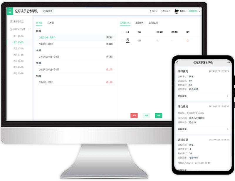 支持学员报名、小票打印、报名信息导出、学员分班、学员结课、课时预警、预约试听到访等功能,促进招生效率。