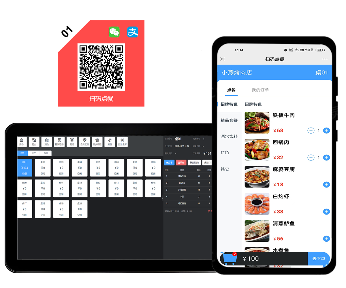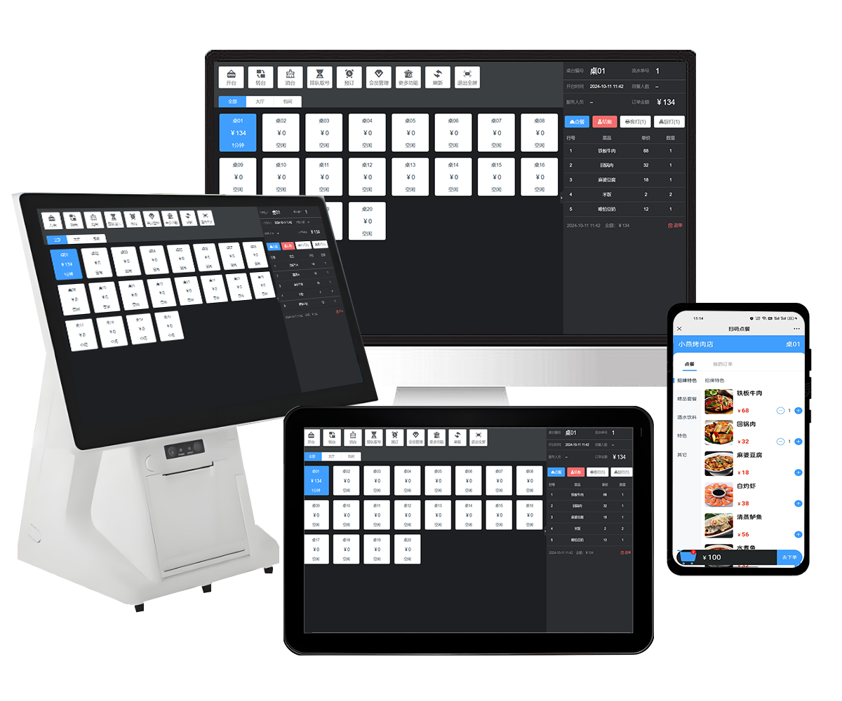 桌台模式: 适用于中餐、火锅等需要桌位的餐饮形式,支持扫码点餐,主要流程:开台、下单、打印、结账或清台等