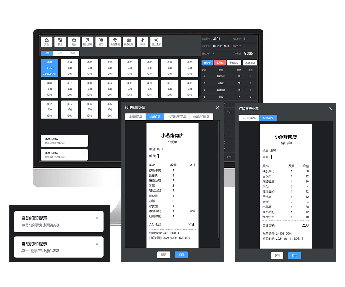 厨单打印:当顾客完成点餐后,系统会自动将订单信息发送到厨房的打印机上,打印出详细的菜品订单。厨房工作人员可以根据订单快速准备菜品,避免了人工传递订单可能出现的错误和延误。
