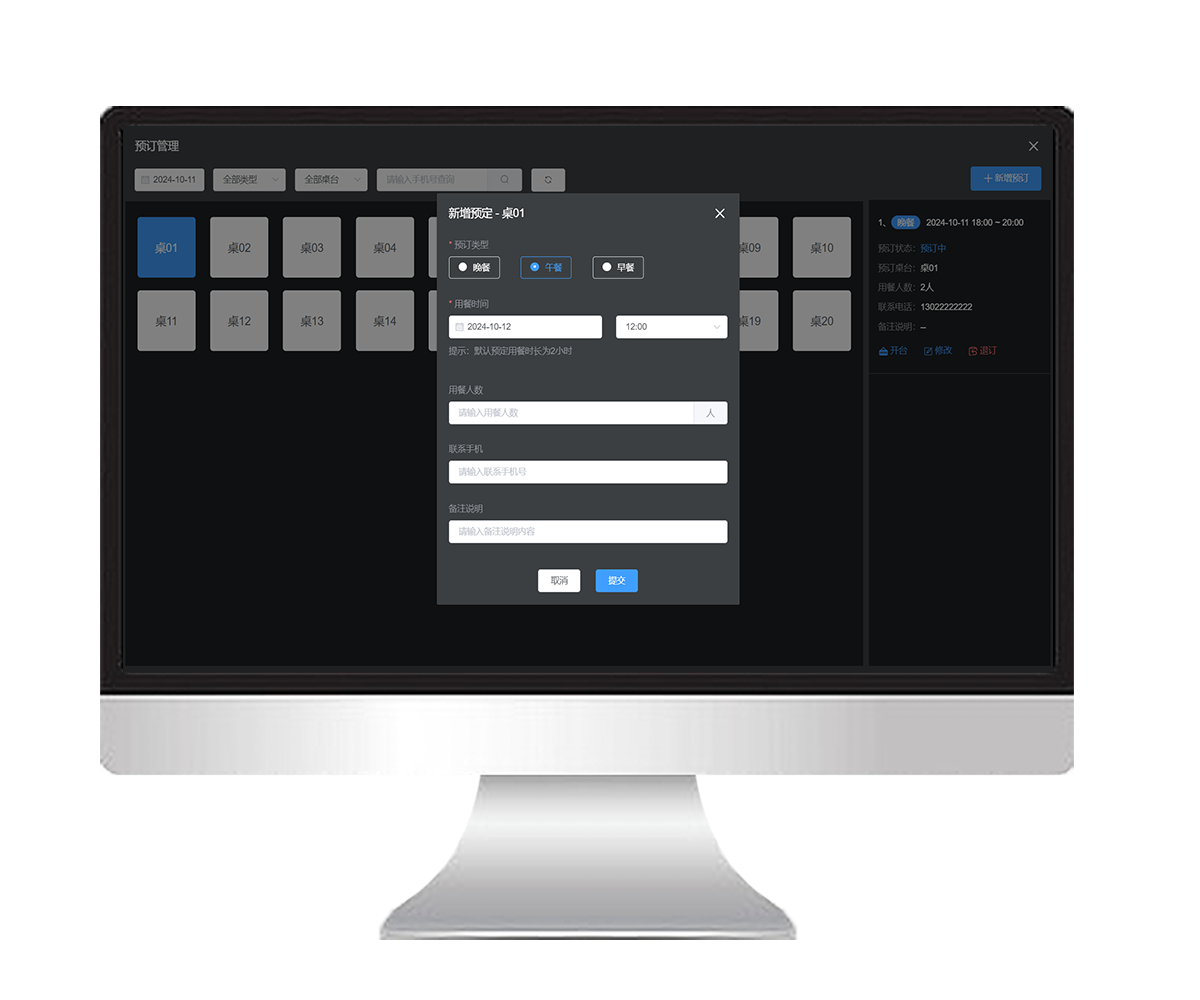 服务员可通过系统选择顾客的到店用餐的时间,进行桌位预定等,方便餐厅进行预定管理,提前安排座位和准备食材。