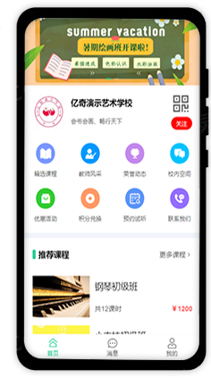 打造机构自己品牌的公众号,品牌形象更专业,家长和老师无需下载安装app,关注机构微信公众号,即可使用,操作简单方便!同时支持学员在线学习课程、教师风采及荣誉动态展示、预约试听、校内空间交流、请假、问题反馈等。