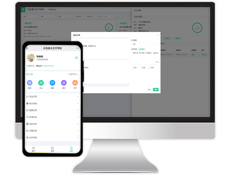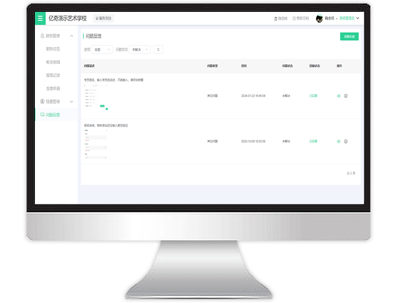 支持管理员随时查看机构财务收支明细、提现、续费情况,及时反馈使用软件过程中遇到的各种问题。