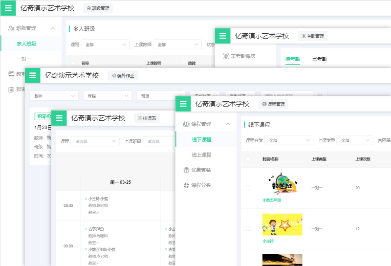 分班排课、考勤消课、作业批改、智能化批量操作,已上、未上课程随时查看,数据清晰、准确,节省教务老师统计时间,大幅提升教学工作效率,提高教育教学质量。