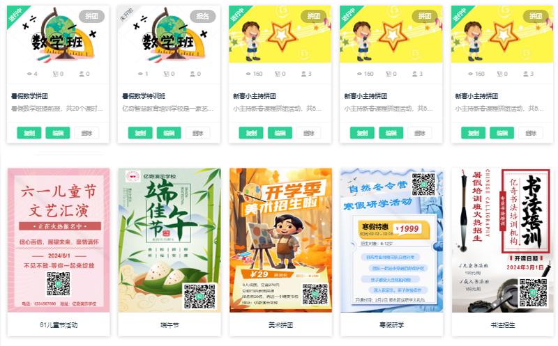 多人拼团、报名活动等多种营销玩法,覆盖各类招生场景,活动海报一键复制,优惠活动吸引家长报名,促进机构增收!
